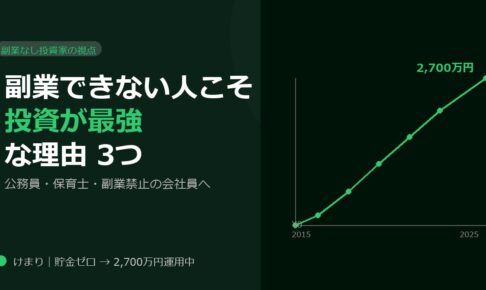 副業禁止でもお金は増やせる。投資は合法・複利・時間効率の3点で副業を圧倒します。貯金ゼロから2,700万円を運用中のけまりが数字で解説。