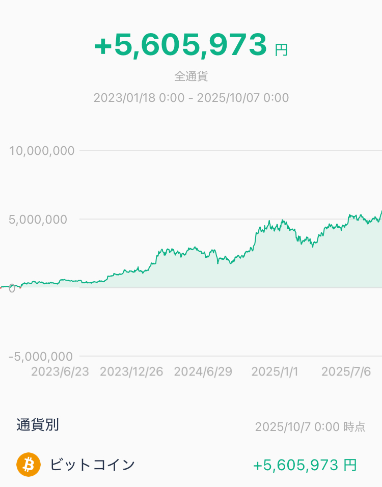 下のグラフが、実際の取引所に表示されているBTC損益の推移だ(2023年1月購入〜2025年10月時点)。