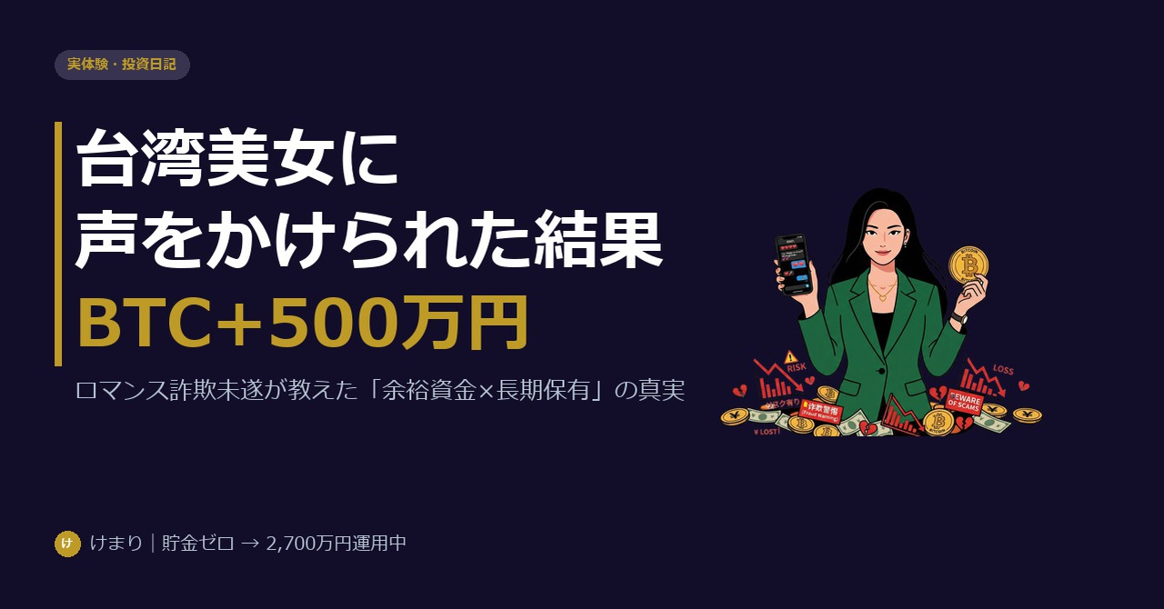 台湾美女に近づかれ → 詐欺と気づき → BTCだけ手元に残った → 含み益500万。